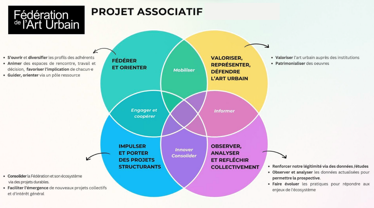 La Fédération est tête de réseau et mène de nombreux projets pour l’art urbain depuis 2019. En 2025, afin d’assurer au mieux son rôle dans l’écosystème culturel, elle a réalisé un DLA (dispositif local d’accompagnement) qui lui a permis de préciser son projet associatif.